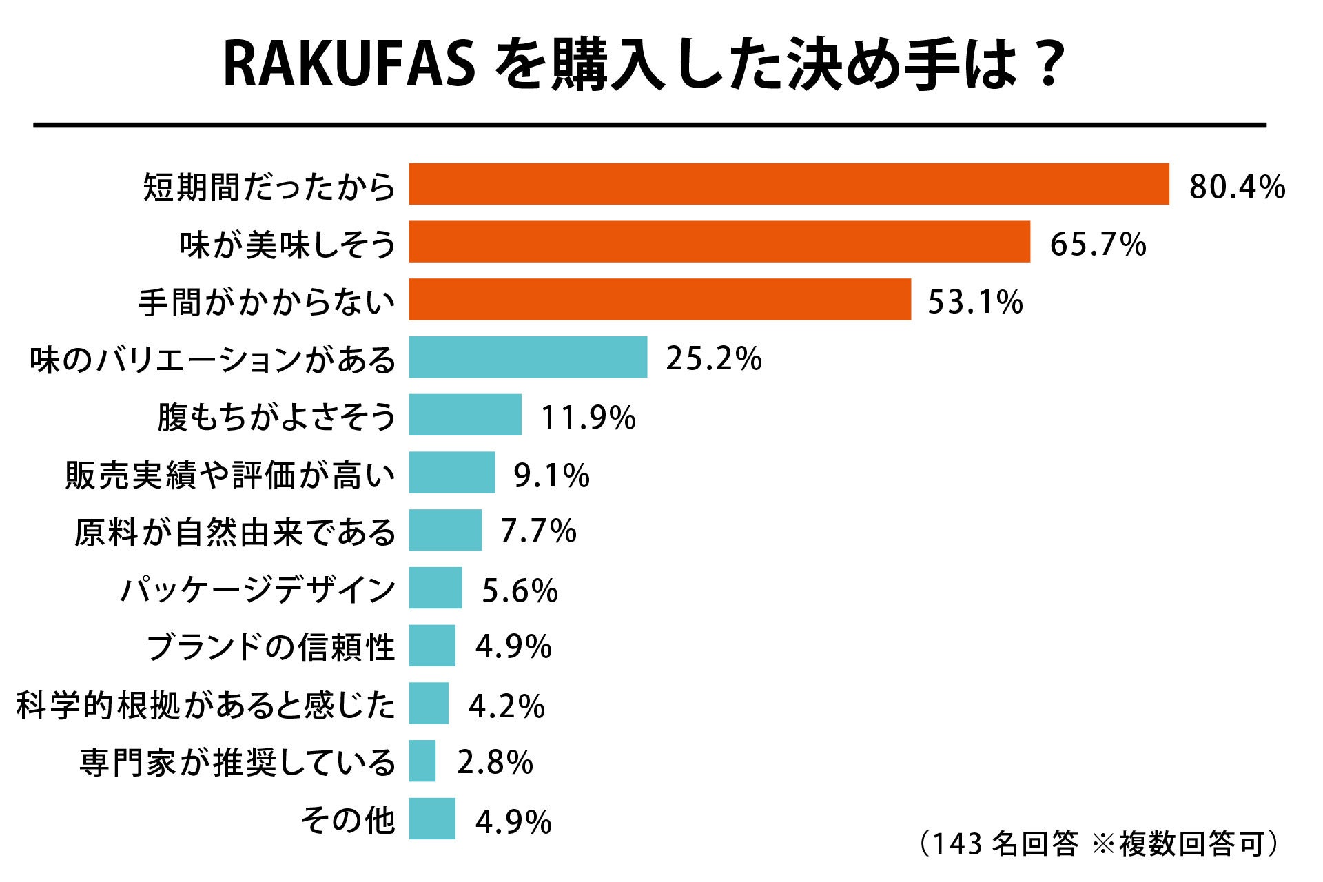 RAKUFASは2023年5月に発売し、同年10月には新味を発表しバリエーションを増やした。コーンポタージュ風味やクラムチャウダー風味など、定番とも言える味とエビの濃厚ビスク風味などの個性的なランナップも増やした。ファスティング中に口にできる物だからこそ味へのこだわりは徹底し、美味しさ訴求も積極的に行った結果、リピート率も3割とファン化を深めている。