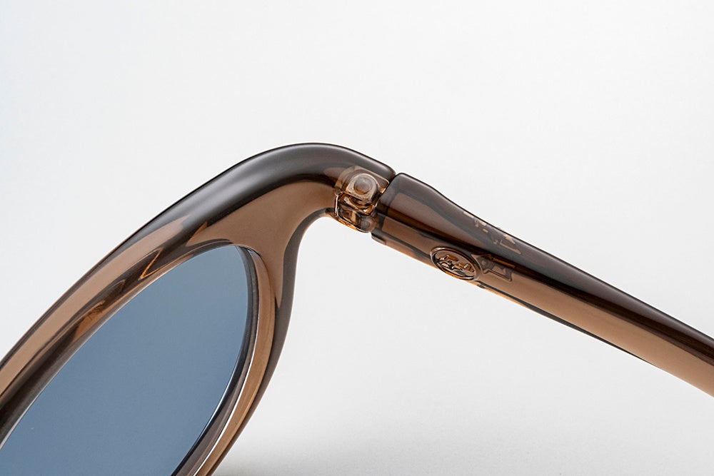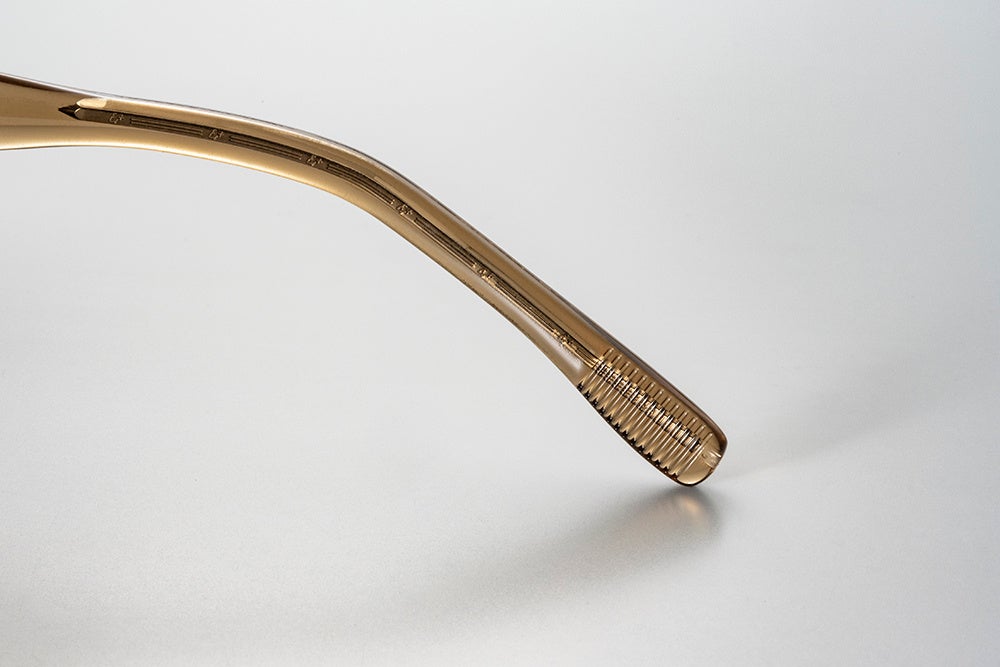 テンプルエンド:通常調整が難しいTR90素材のテンプル内部にオリジナル柄入り芯を組み込んだアジャスタブルテンプル仕様。またテンプル先端部分のみに芯を組み込むことで最適な比重バランスでの装用が可能。