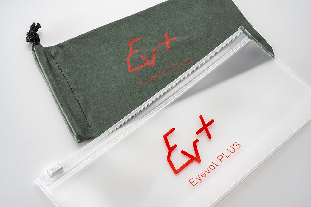 ケース: Eyevol PLUS専用ケース。眼鏡拭きの機能付き巾着も付属。