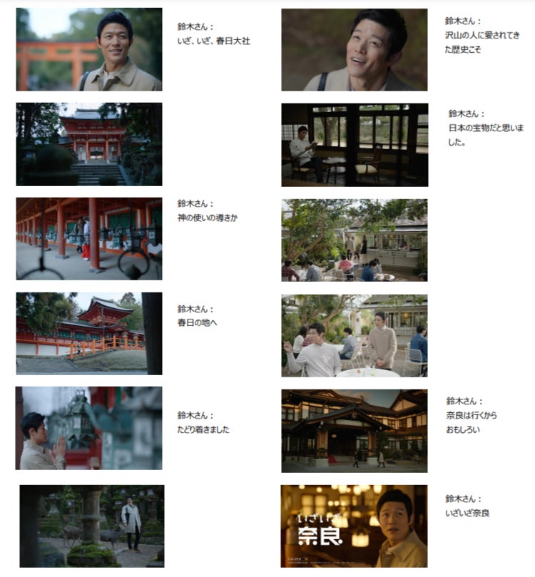 『いざ、いざ、春日大社』という鈴木亮平さんの言葉からCMはスタートします。春日大社を参拝し、緑豊かな参道を鹿と共に歩いたあとに、春日山原始林に堂々と立つ大きな杉を見上げて思わず感嘆の声を上げます。志賀直哉旧居を訪れて読書を楽しんだ後は、開放感あるカフェでチーズケーキを頬張り、カフェの店員さんとの会話を楽しみます。最後はクラシックなホテルに足を運び、内装や調度品を堪能しました。