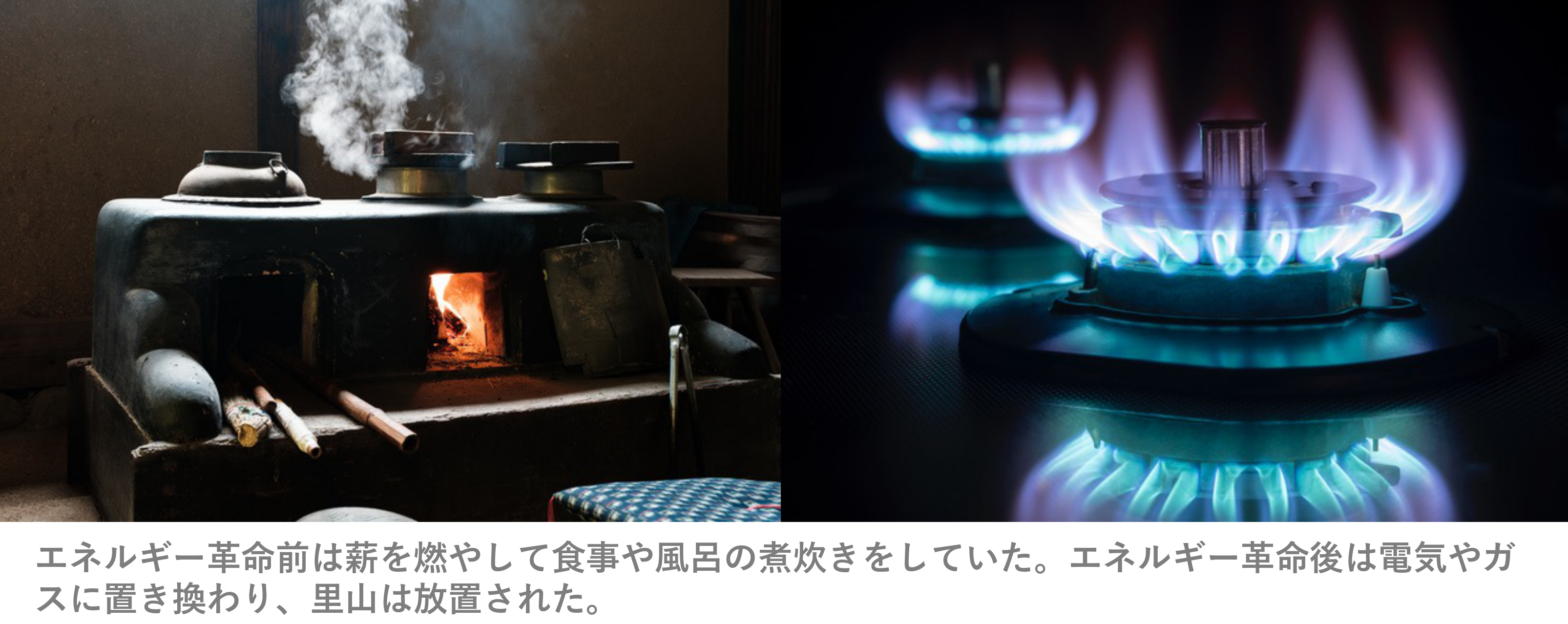 かつての里山では、森は薪や木炭を生産するエネルギー供給源でしたが、エネルギー革命以降はその役割を終えて放置されてしまいました。しかし、百森でんきでは、里山が再び電気というエネルギーの供給源になります。