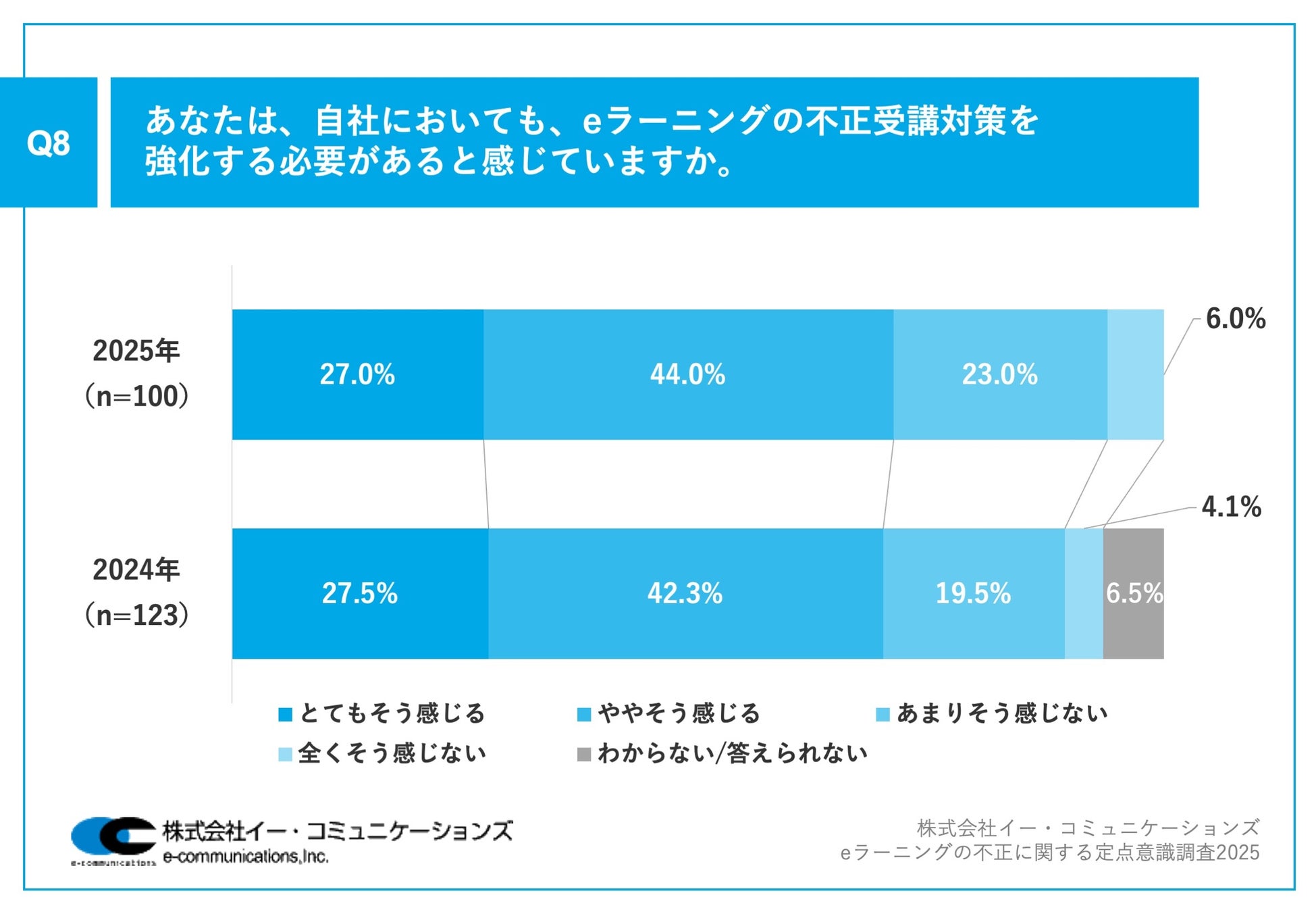 「【定点】Q8. あなたは、自社においても、eラーニングの不正受講対策を強化する必要があると感じていますか。」(n=100)と質問したところ、「とてもそう感じる」が27.0%、「ややそう感じる」が44.0%という回答となりました。