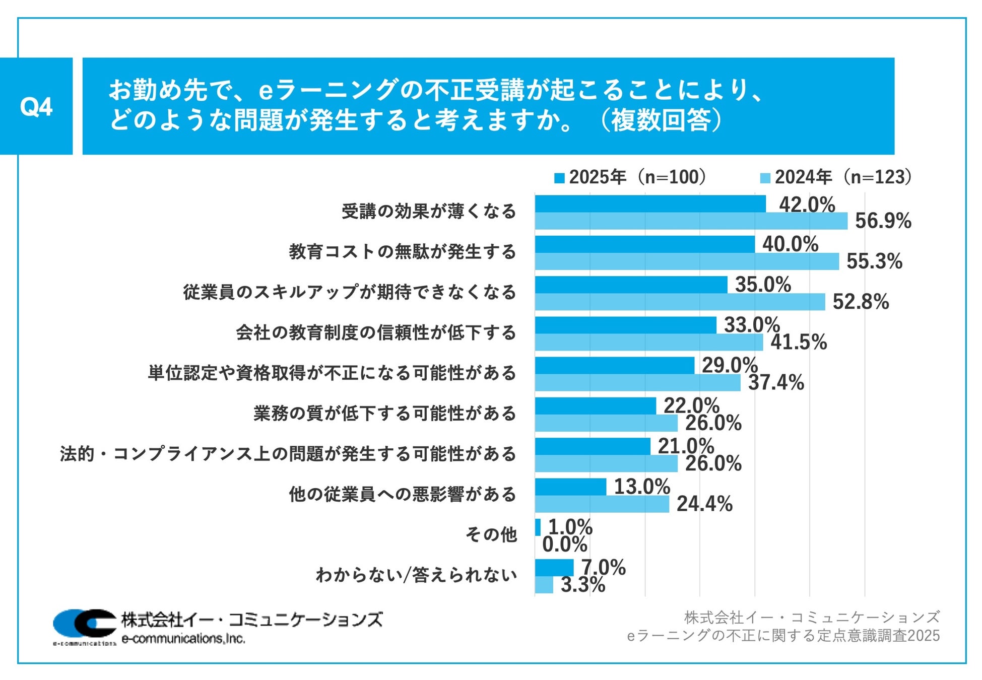株式会社イー・コミュニケーションズ(本社:東京都港区、代表取締役:佐藤信也)は、eラーニング研修を導入している企業の人事・総務担当者100名を対象に、eラーニングの不正に関する定点意識調査2025を実施しましたので、お知らせいたします。