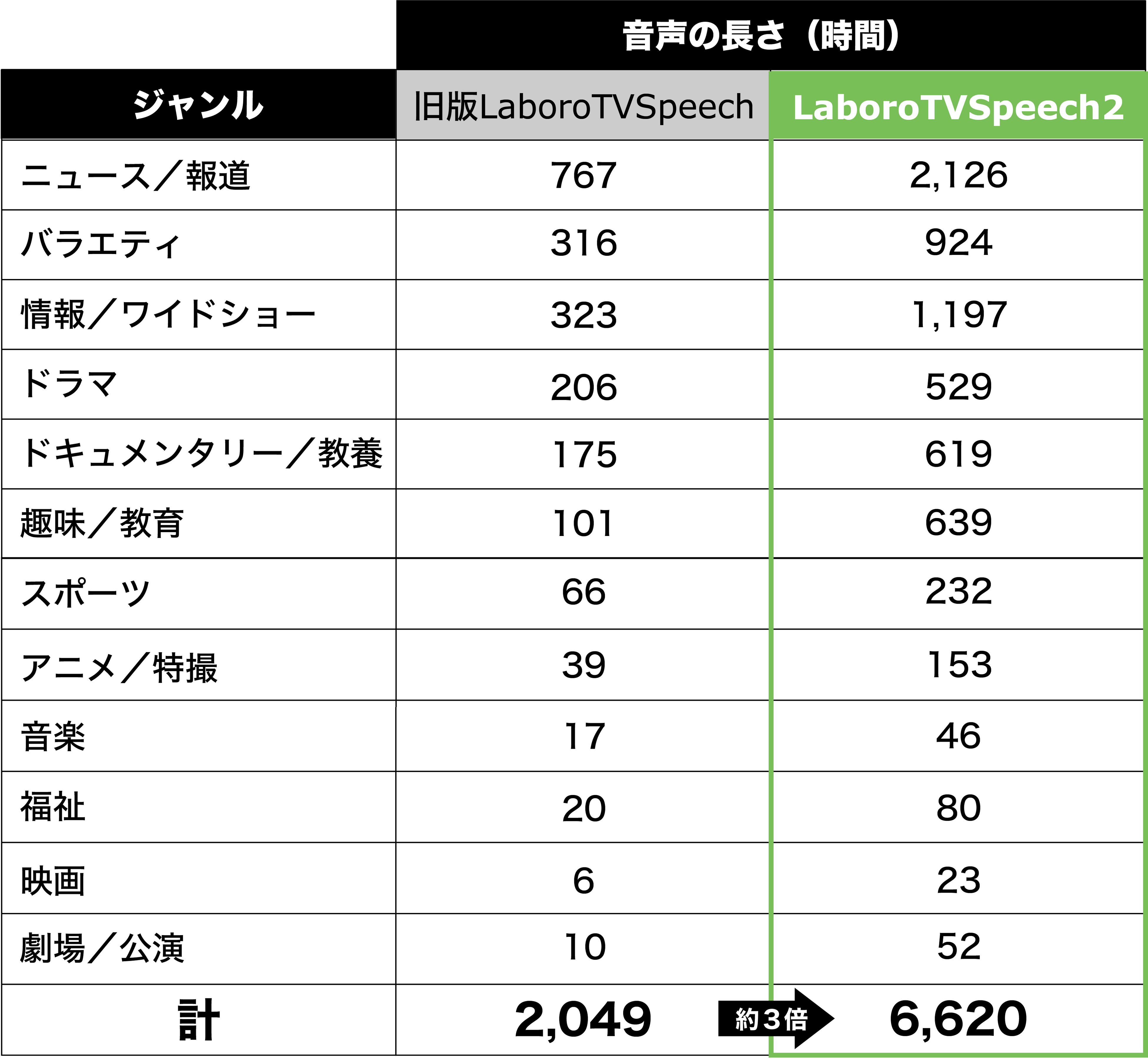 旧版LaboroTVSpeechが12ジャンルの9,142のTV番組、計2,049時間のデータで構成されていることと比べると、そのデータ量は約3倍と大幅に増加しております。