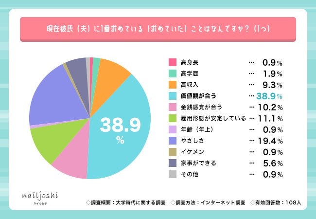 次に「現在彼氏(夫)に1番求めている(求めていた)ことはなんですか?(1つ)」と質問したところ、『価値観が合う』(38.9%)が継続して1位を獲得。2位は『やさしさ』(19.4%)、3位には『雇用形態が安定している』(11.1%)がランクインしました。