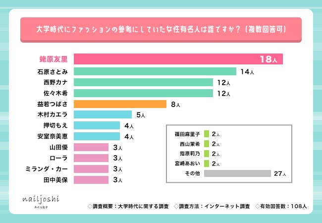 ・大学時代にファッションの参考にしていた有名人、1位は蛯原友里さん(18人)、2位は石原さとみさん(14人)、3位は西野カナさんと佐々木希さん(各12人)