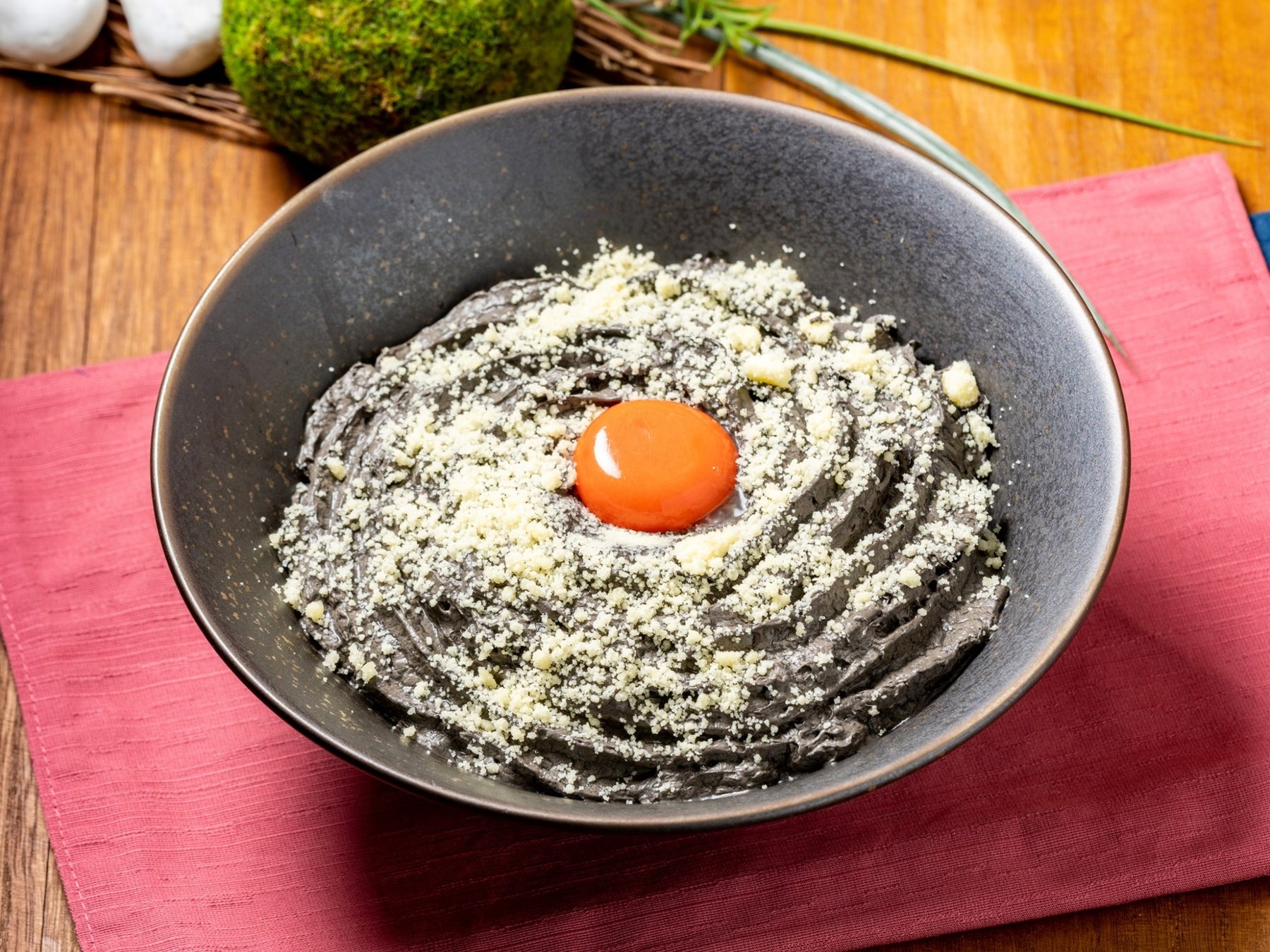 うどんのベースは濃厚なカルボナーラソースとイカ墨を合わせています。