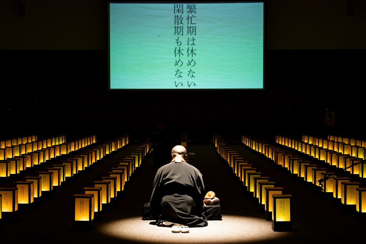 この現状を周知させるため、ネット上で募集した「有給をとれなくて悔やまれた体験」を印字した灯籠を約300基並べ、実際に僧侶の方に供養していただくイベントを企画・実施しました。