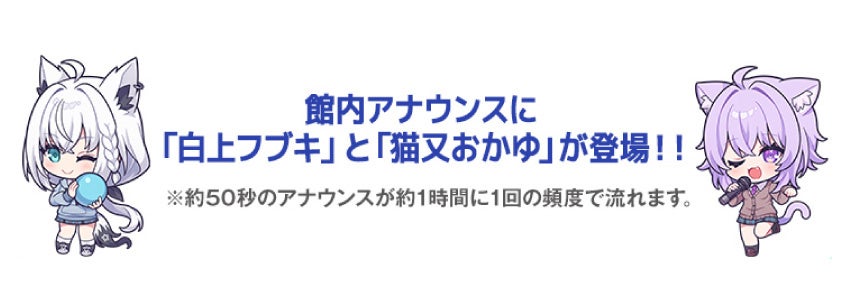 全国の100店舗にて、館内アナウンスに「白上フブキ」と「猫又おかゆ」が登場します。
