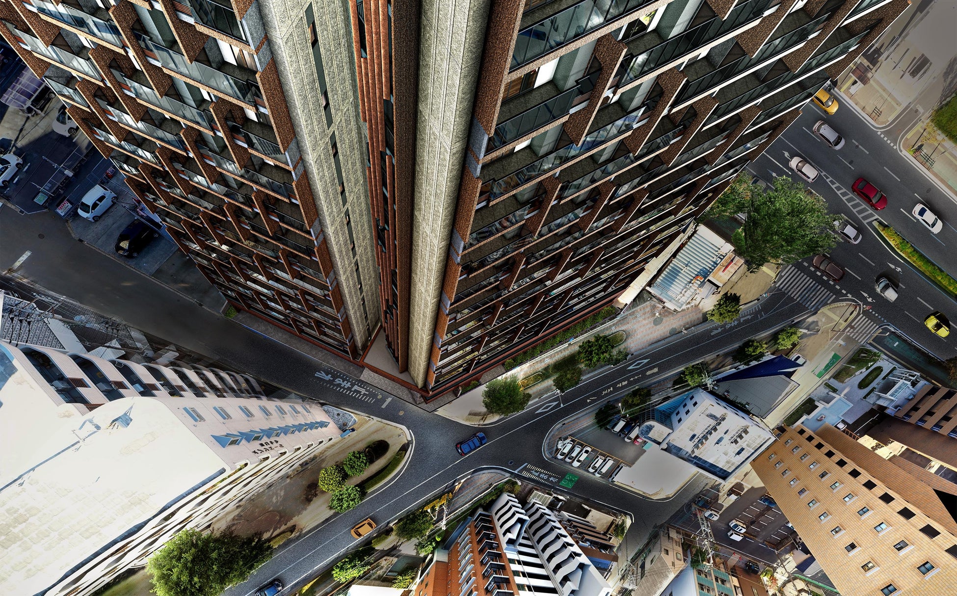 ※2)掲載の航空合成外観完成予想CGは現地周辺の航空写真(2025年11月撮影)に計画段階の図面を基に描き起こした外観完成予想CGを合成・加工したもので実際とは異なる場合があります。なお、外観の細部・設備機器及び周辺建物等は一部省略又は簡略化しております。植栽は計画段階のもので植種・設定位置・植高・本数等は変更となる場合があります。竣工時には完成予想CG程度には成長しておりません。