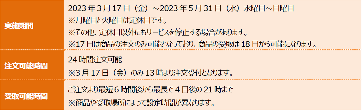 ※商品ごとに受取時間や受取箇所が設定されていますので、詳細は専用サイト(http://pikuraku.com/ )をご覧ください。