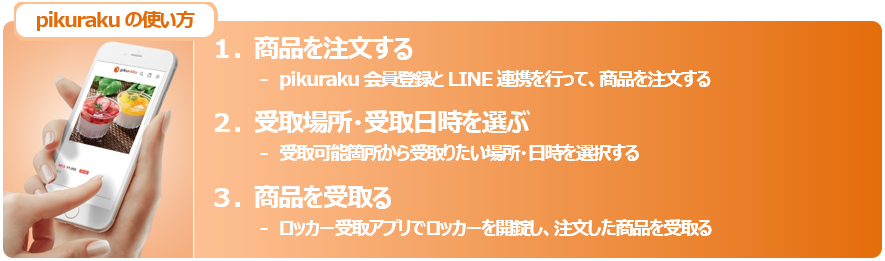 「pikuraku(ピクラク)」の専用サイト(http://pikuraku.com/)で商品をご購入いただき、ご自身の好きなタイミングで駅や商業施設に設置された pikuraku 対応ロッカーで商品の受取が可能です。pikuraku 対応ロッカーは、大阪駅(うめきたエリア含む)をはじめとして、北新地駅、大阪天満宮駅、高槻駅の 4 駅に設置しており、各駅で常温の商品と冷蔵の商品が受取可能となっております。