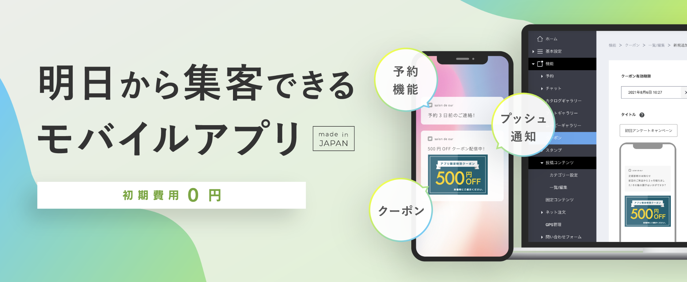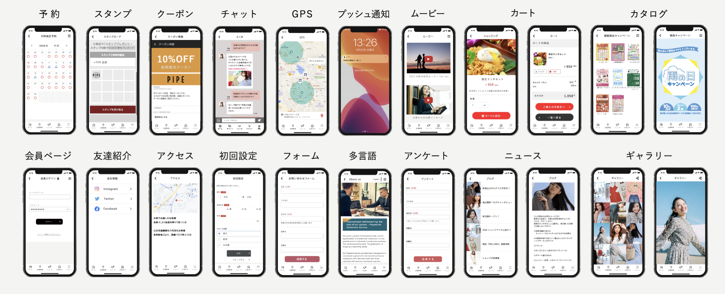 Web予約/スタンプ(ポイントカード)/クーポン/チャット/GPS/プッシュ通知/