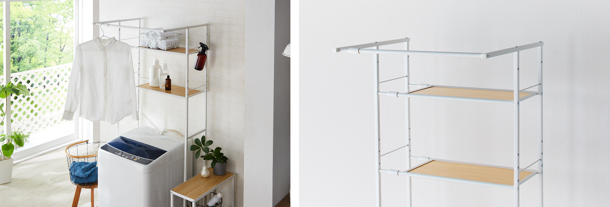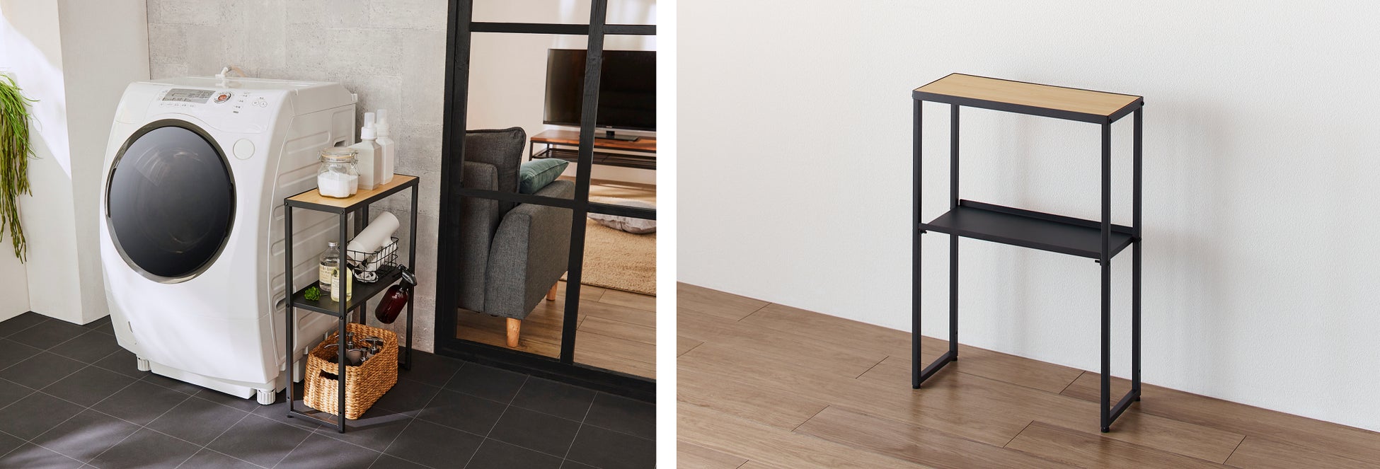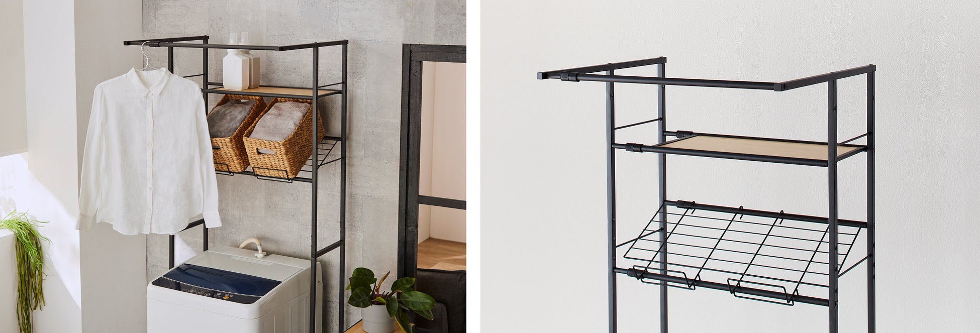 空間に映えるランドリー収納。マットな質感のフレームに木目調の棚がアクセントの「ランドリーラック」が新登場。