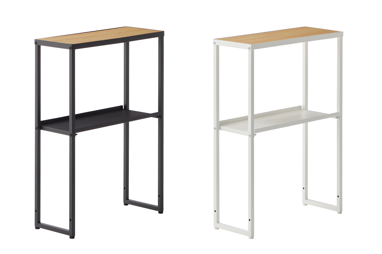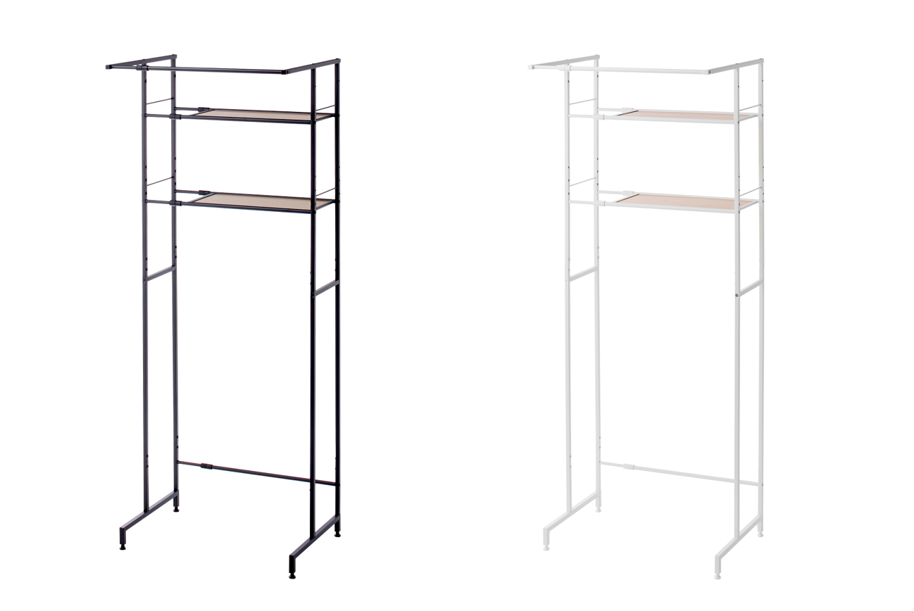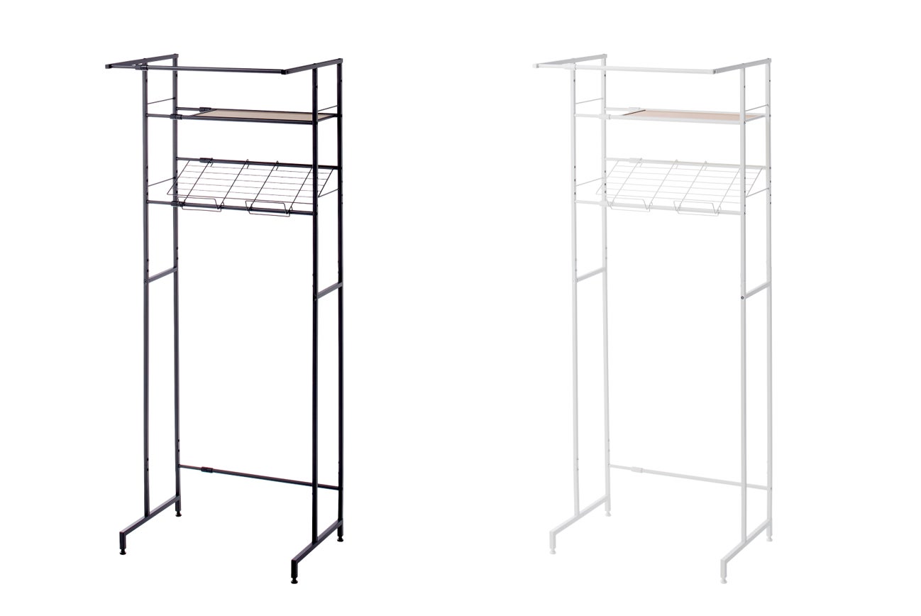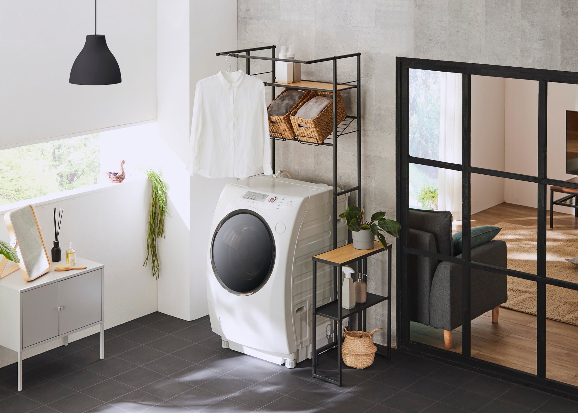 空間に映えるランドリー収納。マットな質感のフレームに木目調の棚がアクセントの「ランドリーラック」が新登場。