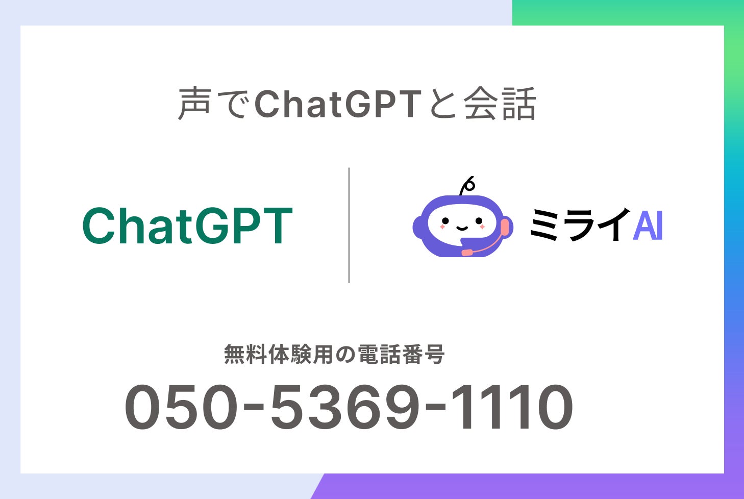 ※「ミライAI電話GPT」は、米OpenAIが2023年4月24日(現地時間)付けで発表しましたブランドガイドラインに基づき、名称を「ミライAI 特別企画『ChatGPT電話体験窓口』」に変更いたしました。 詳しくはニュースリリース(https://www.miraiai.jp/miraiai-productname_n230509.html)をご確認ください。以下のニュースは掲載当初の内容となります。