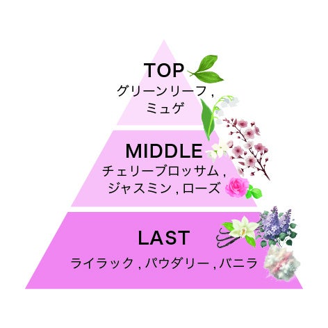 芳醇で優美なソメイヨシノをイメージした、華やかで心地良い桜の香り。時間とともにライラックとバニラのパウダリーな甘さが溶け込むように広がり、奥行きのある余韻をもたらします。