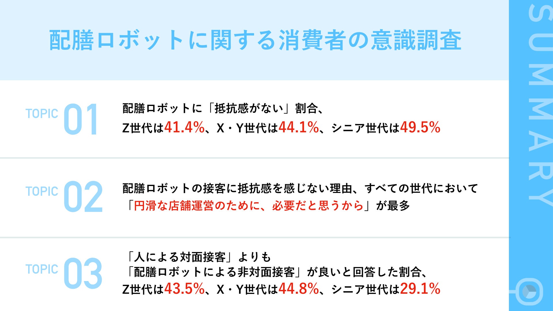 【配膳ロボットに関する世代別の意識調査】飲食店での配膳ロボット接客、「抵抗感なし」シニア世代が最も多く半数の49.5%が回答!Z世代の見解は?