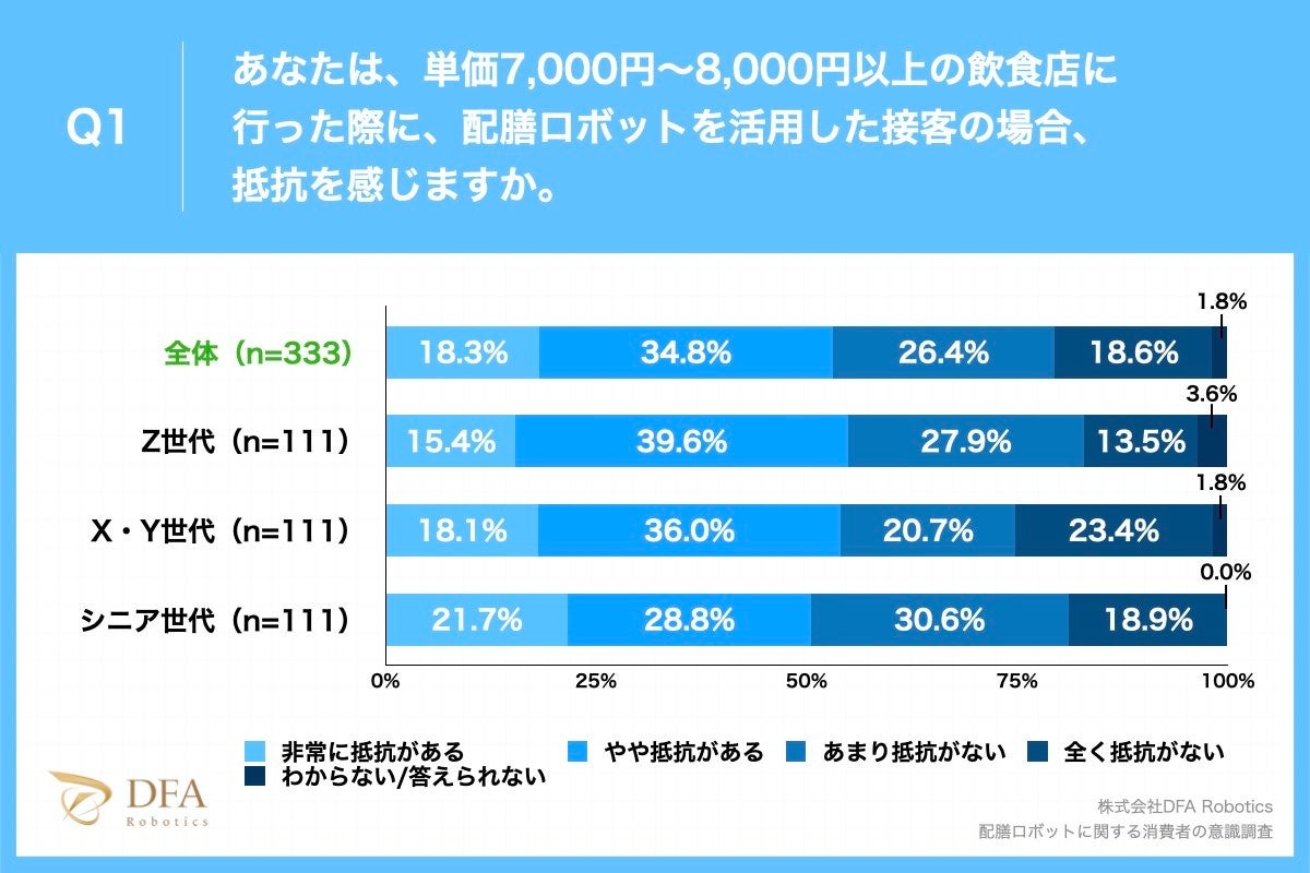 飲食店DXを推進するロボティクスソリューションカンパニーである株式会社DFA Robotics(本社:東京都渋谷区恵比寿 代表取締役:波多野昌昭)は配膳ロボットに関する消費者の意識について、月に1回以上、単価7,000円以上の飲食店へ行く、Z世代(18~26歳以下)、X・Y世代(27~58歳)、シニア世代(60歳以上)それぞれ111名の合計333名を対象にアンケート調査を行いましたので、その結果をお知らせします。