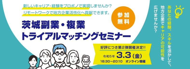 エッセンス株式会社(本社:東京都中央区、代表取締役社長:⽶⽥ 瑛紀、以下「当社」)は、3月3日(金)、茨城県プロフェッショナル人材戦略拠点と連携の上「茨城副業・複業トライアルマッチングセミナー」を開催します。本セミナーの第一弾は昨年10月28日に開催され、非常に好評だったため第二弾を開催する運びとなりました。