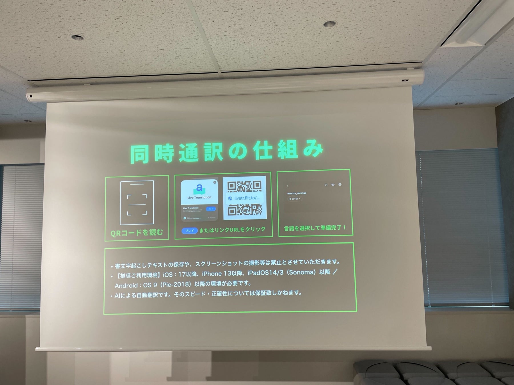 会場のスクリーンには、英語の発言とその日本語訳が同時に表示され、視覚的にも聴覚的にも情報を補完。また、参加者は自身のスマートフォンからも字幕を確認できるため、個々のニーズに合わせた情報取得が可能となりました。