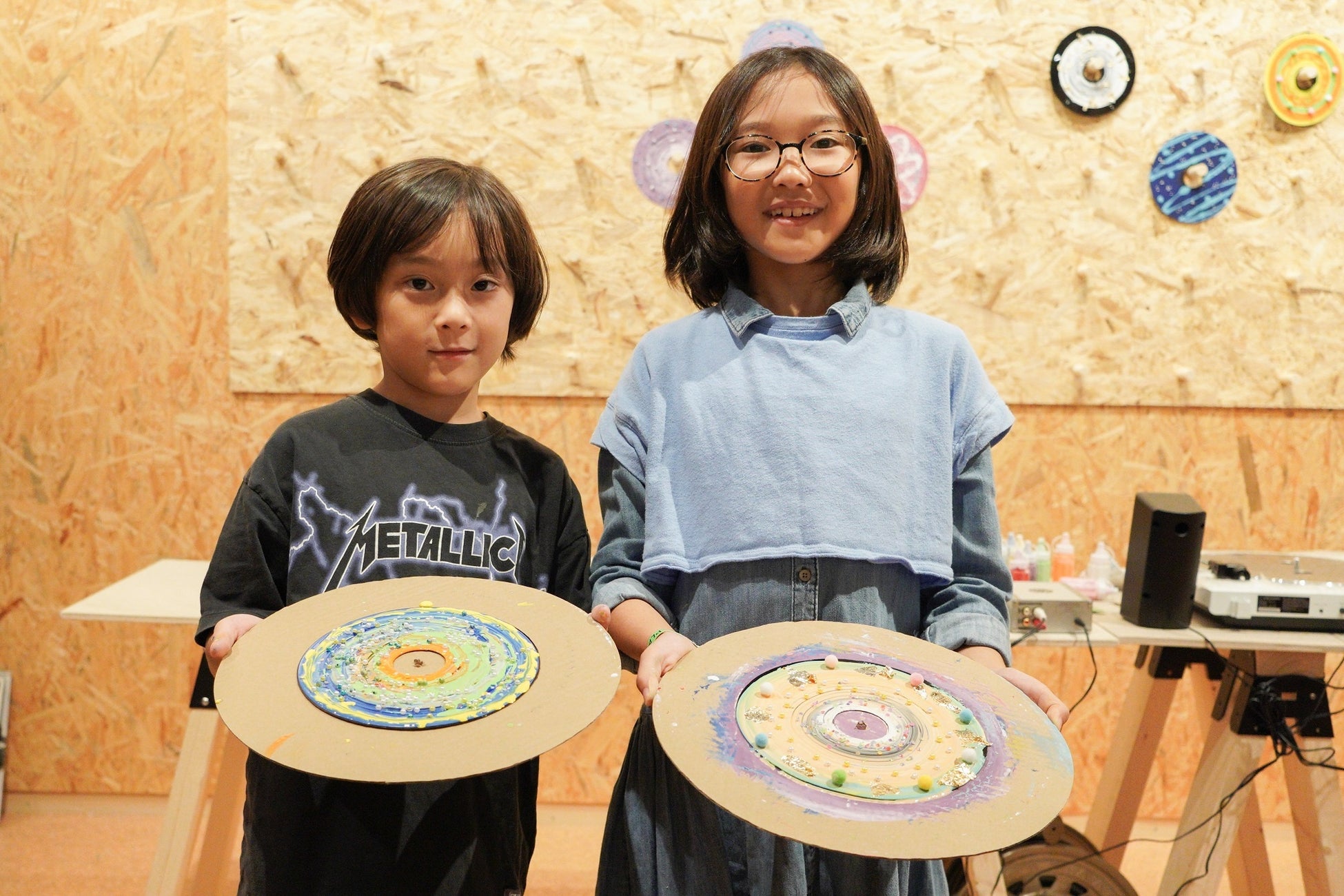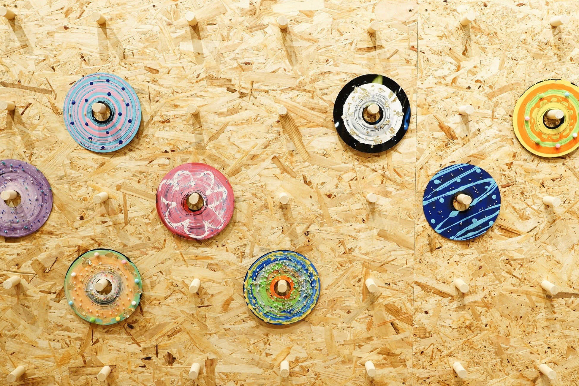 ワークショップ「レコードーナツをつくろう」で完成したレコードをPLAY! PARKの〈ギャラリー〉で展示しています。