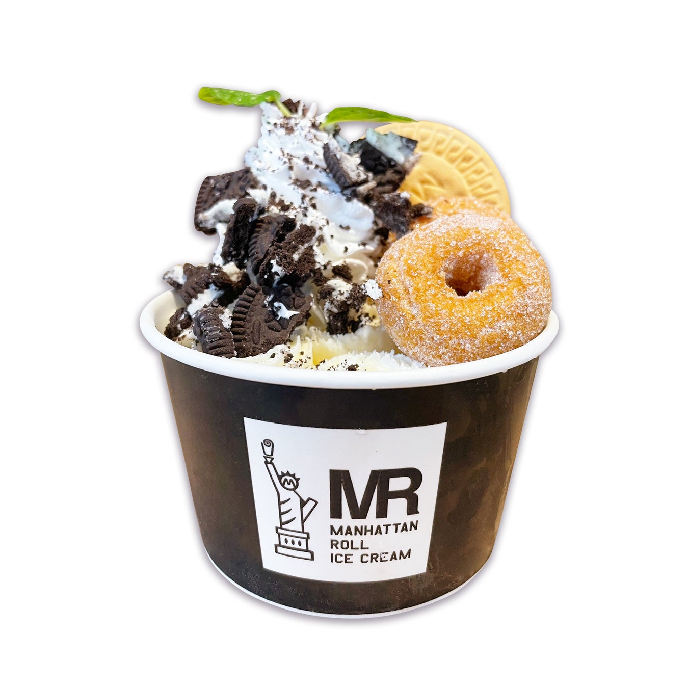 マンゴーソースベースのアイスに、ミニドーナツと砕いたオレオをトッピングしました。