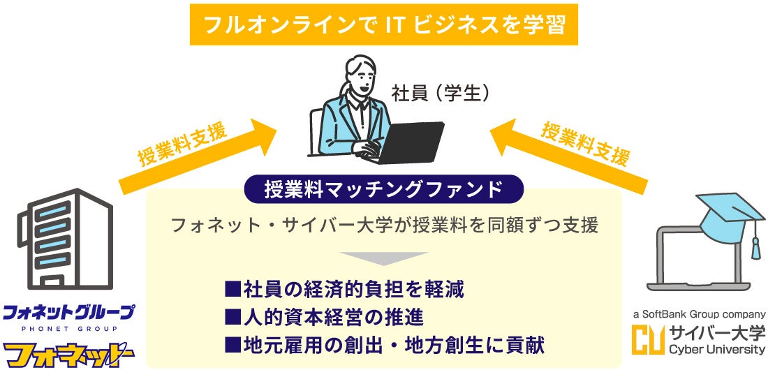サイバー大学(学長:川原 洋、所在地:福岡市東区、以下「本学」)は、株式会社フォネット(代表取締役:清水 栄一、本社:山梨県甲府市、以下「フォネット」)と連携し、2025年4月から本学へ入学するフォネットグループの社員向けに「授業料マッチングファンド」を適用します。