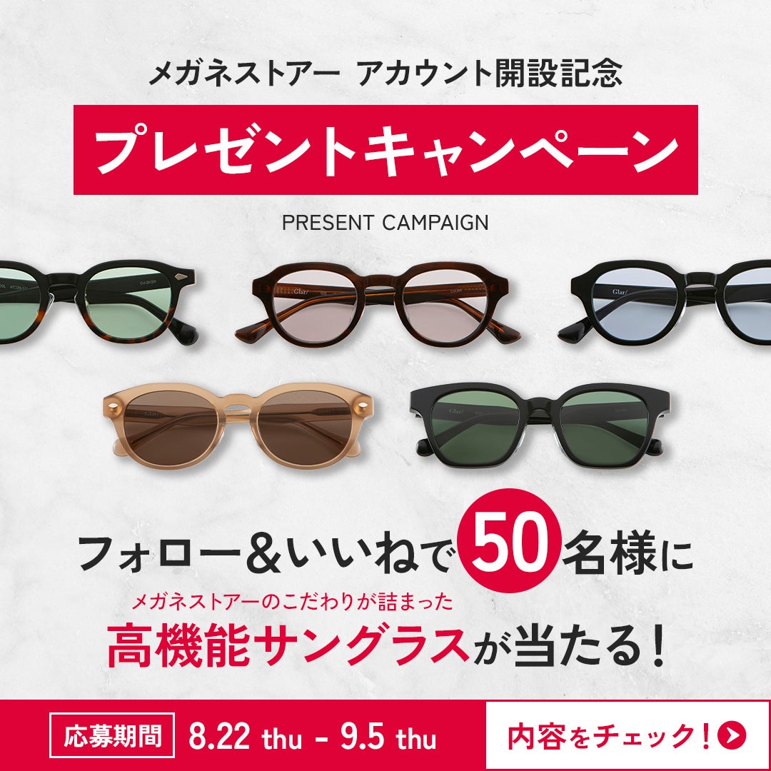 メガネストアー公式Instagramアカウント(@meganestore_official)をフォローし、キャンペーン投稿に「いいね!」をしていただいた方の中から抽選で50名様に、メガネストアーのこだわりが詰まった高機能サングラス『Glar/(グラー)』をプレゼントいたします。