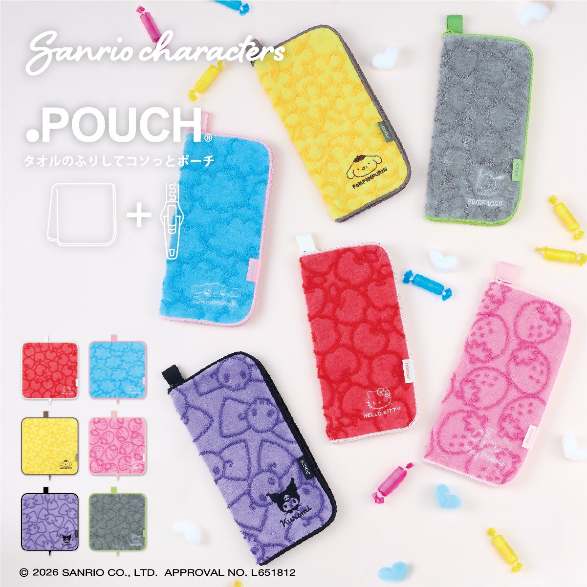 タオルのふりしてコソッとポーチの「どっとポーチ」に、サンリオキャラクターズデザインが新たに6アイテム登場!アイアップ公式オンラインストアで好評予約受付中。