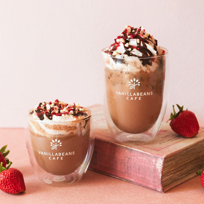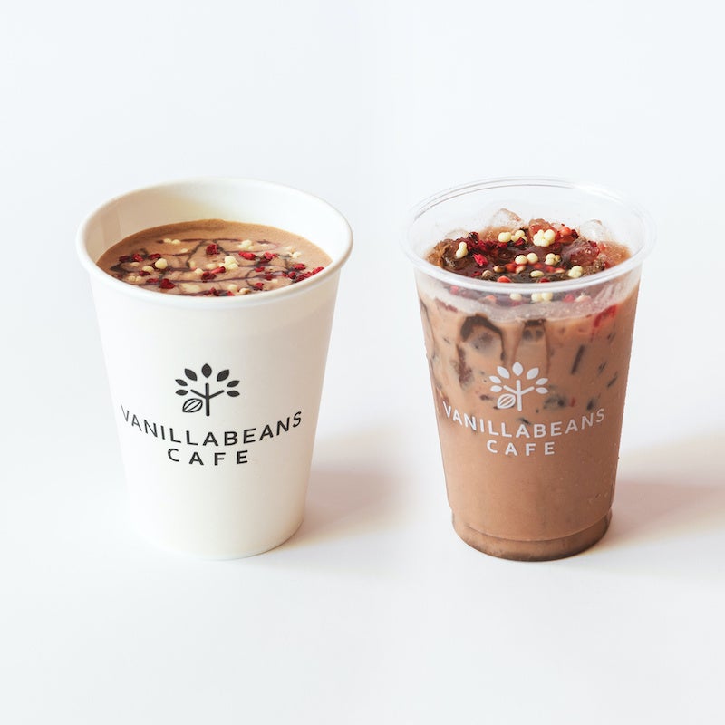 VANILLABEANSオリジナルのチョコレートに、苺のピューレをたっぷりと加えてブレンドした期間限定のドリンクを、テイクアウトカップでご用意します。トッピングは、店舗で作るチョコレートソースと甘酸っぱさをプラスするフランボワーズソースに、ホワイトチョコレートのパフとドライフランボワーズを散りばめました。
