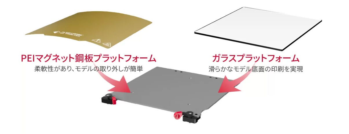 一方で、PEIマグネット鋼板プラットフォームは前機種よりも凹凸面の耐久性が向上し、フィラメントが定着しやすくなりました。また、柔軟性があるため、造形物を簡単に取り外せます。