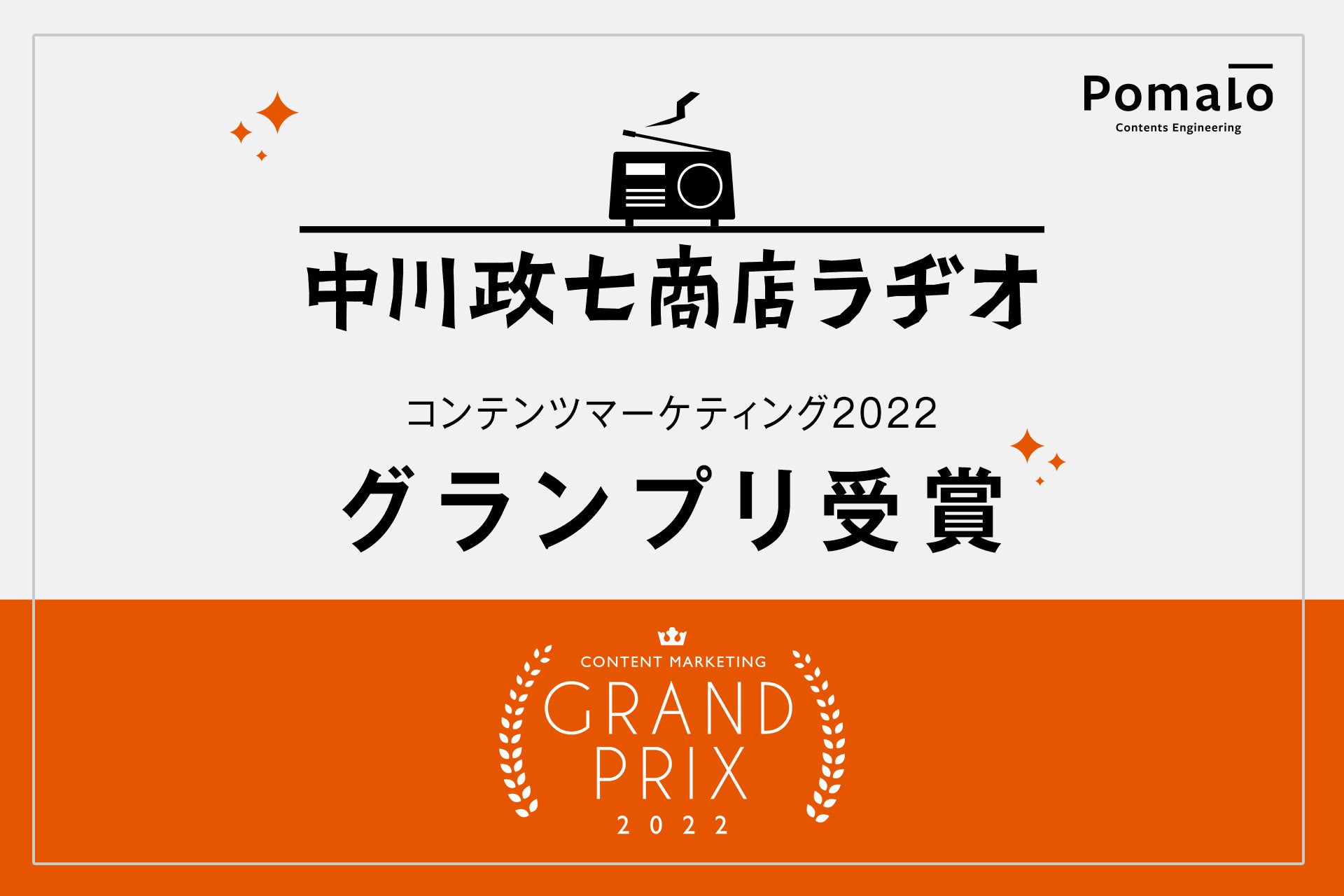 コンテンツ力を活かしてより良いコミュニケーション施策を提供するPomalo(ポマーロ)株式会社( 本社:東京都渋谷区、代表取締役社長:高橋崇之、以下Pomalo https://www.pomalo.jp/ )が共同プロデュースしている株式会社中川政七商店(本社:奈良県奈良市、代表取締役社長:千石あや、以下中川政七商店)のインターネットラジオ番組「中川政七商店ラヂオ(https://story.nakagawa-masashichi.jp/category/feature/radio)」が、Content Marketing Academyとオウンドメディア勉強会が主催する「コンテンツマーケティング・グランプリ 2022」の「音声コンテンツ部門」にてグランプリを受賞しました。