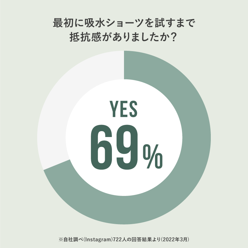 一方で、吸水ショーツを知っている人のうち利用したことのある方は約13%(※1)と少なく、利用するまでのハードルがまだまだ高いことがわかります。NagiのInstagramにて行ったアンケートでは、「最初に吸水ショーツを試すまで抵抗感がありましたか?」という質問に対し69%が「YES」と回答し、「どんなところに抵抗がありましたか?」という質問に対しては、「モレが不安」「種類がたくさんありどれがよいかわからない」「汚れがしっかり落ちるのか心配」といった声が多く上がりました。