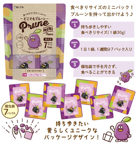 私たち、デルタのカリフォルニアプルーンは味わい深く、水分値やおいしさにこだわってきました。もちろん、このおいしさを支持してくださるお客さまも多くいらっしゃいますが「プルーン=食べにくい」という印象は強く、これを払拭するために「いつでも、どこでも食べられる、持ち歩きたいプルーン」をコンセプトに商品開発を進め、パッケージには様々な場所で楽しそうに過ごす「プルーンちゃん」のイラストを採用することで、親しみやすいデザインに仕上げました。1食分ごと個包装されているため、家でもオフィスでも、外出先でもいつでもどこでも袋のままパクっと食べていただけます。