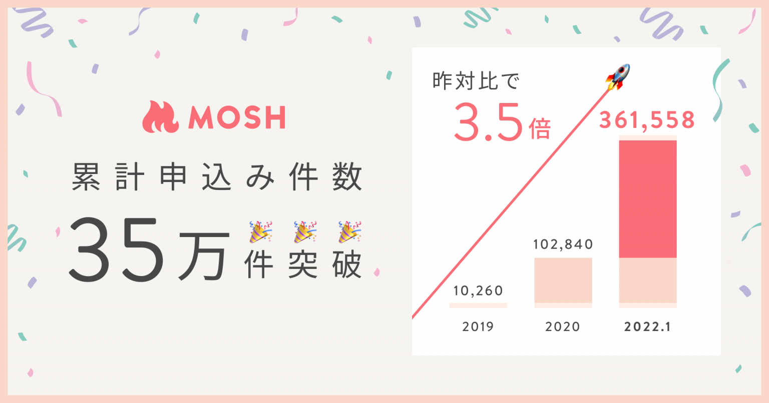 MOSH株式会社(本社:東京都目黒区、代表取締役社長:籔 和弥)は、 ネットでサービスを売れる個人ブランド支援サービス「MOSH」にて、サービスの累計申込み件数が35万件(※1)を突破したことをお知らせします。