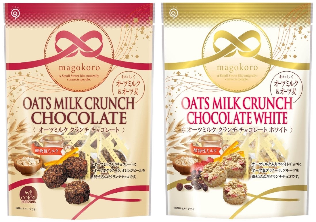 2023年春夏より「magokoroオーツミルククランチチョコレート」「magokoroオーツミルククランチチョコレートホワイト」の2品を新たに販売致します。急上昇中の植物性ミルクであるオーツミルクを使用したチョコレートで、あっさりとほのかな甘みのオーツミルクと混ぜ込まれたフルーツの味わいやクランチの食感が楽しい商品に仕上げました。