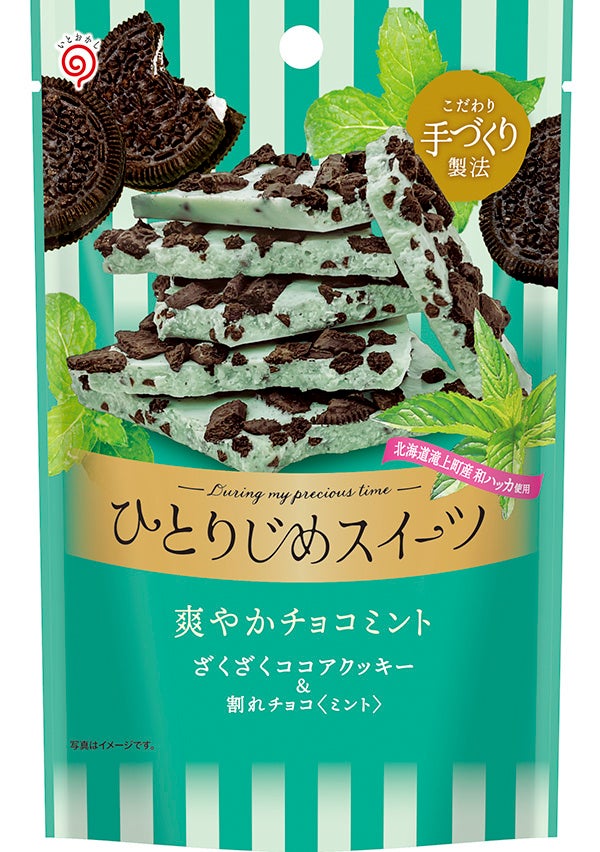 2023年春夏は「ひとりじめスイーツ爽やかチョコミント」を限定で販売致します。北海道滝上町和ハッカ・ラボ様ご協力のもと、滝上町で栽培から蒸留まで行った和ハッカ精油を使用したミント風味のチョコレートに、ザクザク食感のココアクッキーとチョコチップをトッピングしました。華やかな見た目で優しいミントが味わえる割れチョコに仕上げました。