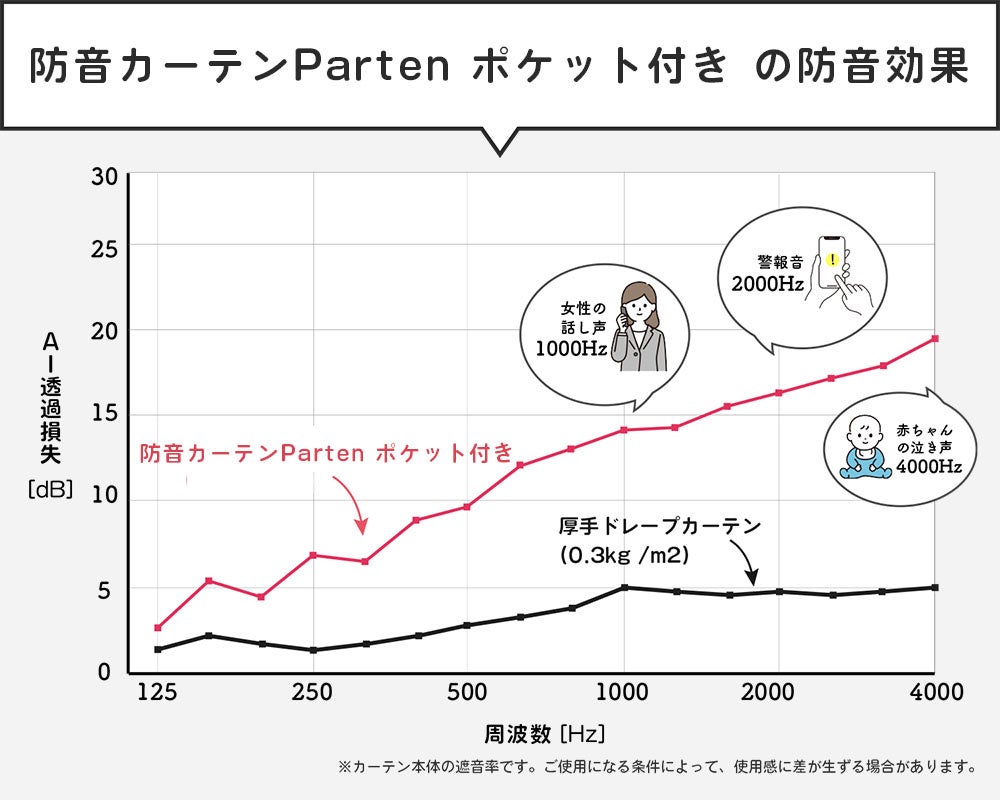 「Parten ポケット付きタイプ」のカーテン生地は、音を吸収する「吸音布」と音を遮断する「遮音布」を組み合わせて作られています。通常のカーテンと比較して、高い防音効果を発揮します。