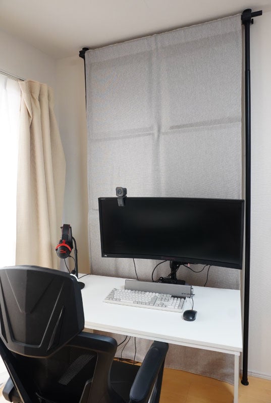 デスク横に「パーテン ポケット付き」を取り付けて、間仕切りにも○