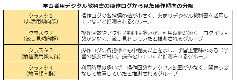 本研究では、家庭学習時における学習者用デジタル教科書(中学校英語)の操作ログから、各生徒が学習に意味のある操作をどれくらいしていたか(学習の強度)を推測するために、学習上無関係と推測されるログを除外した上で主成分分析を行い、その結果に基づき、生徒の操作傾向を下記の4つのクラスタに分類しました。