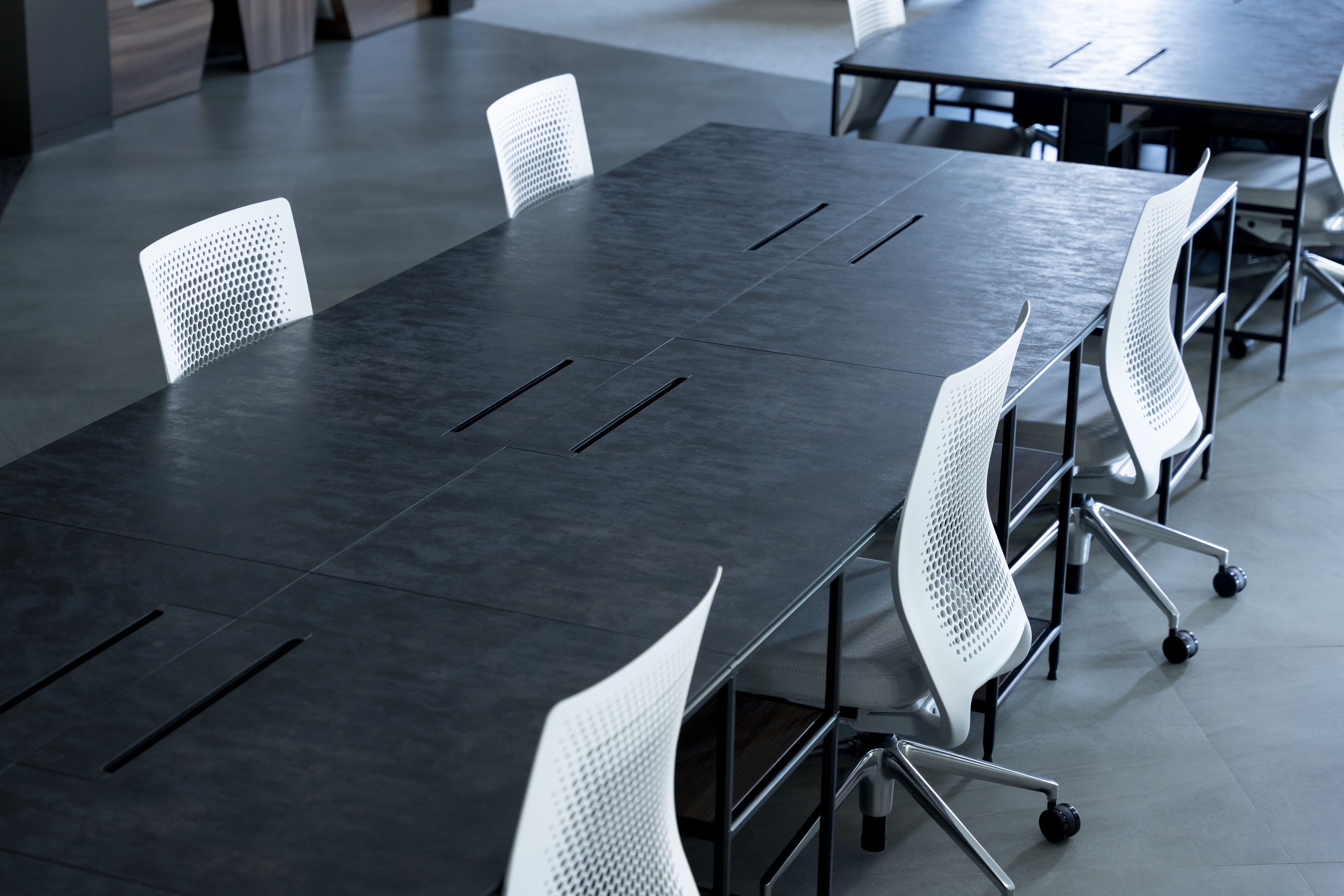 連結したデスクやローボードはフレームがトップに表れますが、オーバーレイ天板を重ねて設置することで境目がトップに表れません。配線を隠すカバーを取り付けることも可能です。オルガテックでは、石川県金沢市の伝統色「加賀五彩」の臙脂色と草色をイメージしたカラー天板のデスクと、石調の面材のシェルフとローボード(先行展示)を展示します。