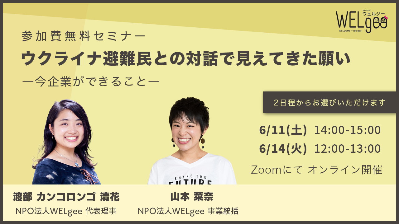 NPO法人WELgee(所在地:東京都渋谷区 代表理事:渡部カンコロンゴ清花、以下WELgee)は、ウクライナ避難民の雇用を検討している企業様向けに、当事者の声や就労ニーズ・企業様が今できることをお伝えするイベントを6月11日(土)14日(火)で開催いたします。