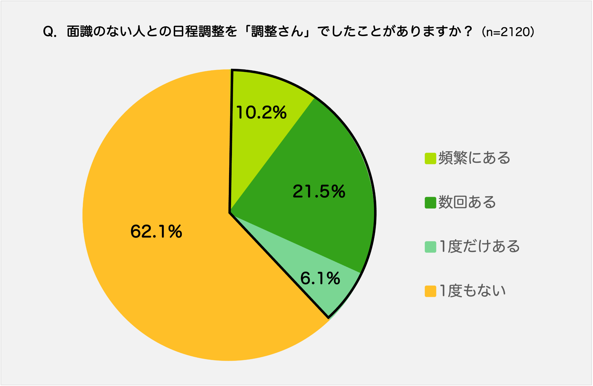 調整さんユーザーに面識のない人との日程調整を「調整さん」でしたことがあるか聞いたところ「一度もない」が最も多く、62.1%となりました。一方で「頻繁にある」は10.2%、「数回ある」と答えた人は21.5%、「1度だけある」は6.1%となり、全体の37.8%が調整さんを「面識のない人との日程調整」で活用していることが分かりました。