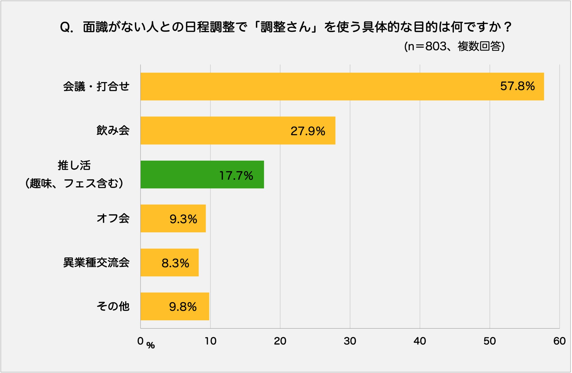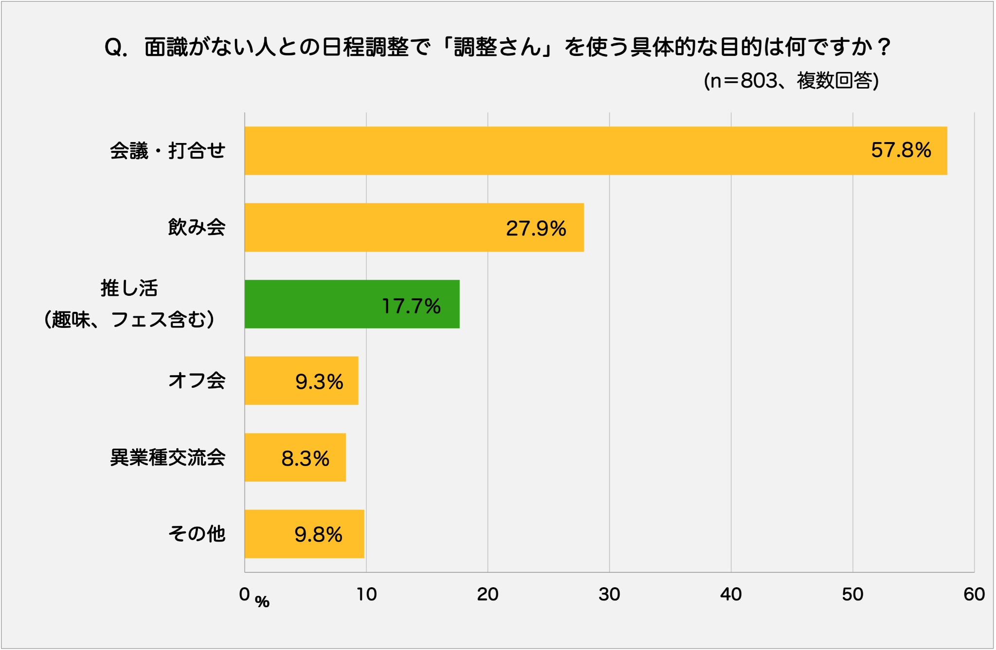 上記の質問で、面識がない人との日程調整を「調整さん」でしたことが1度でもあると答えた人を対象に、面識がない人と日程調整をする目的について質問しました。複数回答で聞き取ったところ「推し活(趣味、フェス含む)」の答えが17.7%となり3番目の多さとなりました。この他「会議・打合せ」が半数以上(57.8%)を占め、ビジネス用途でも使われていることが分かりました。