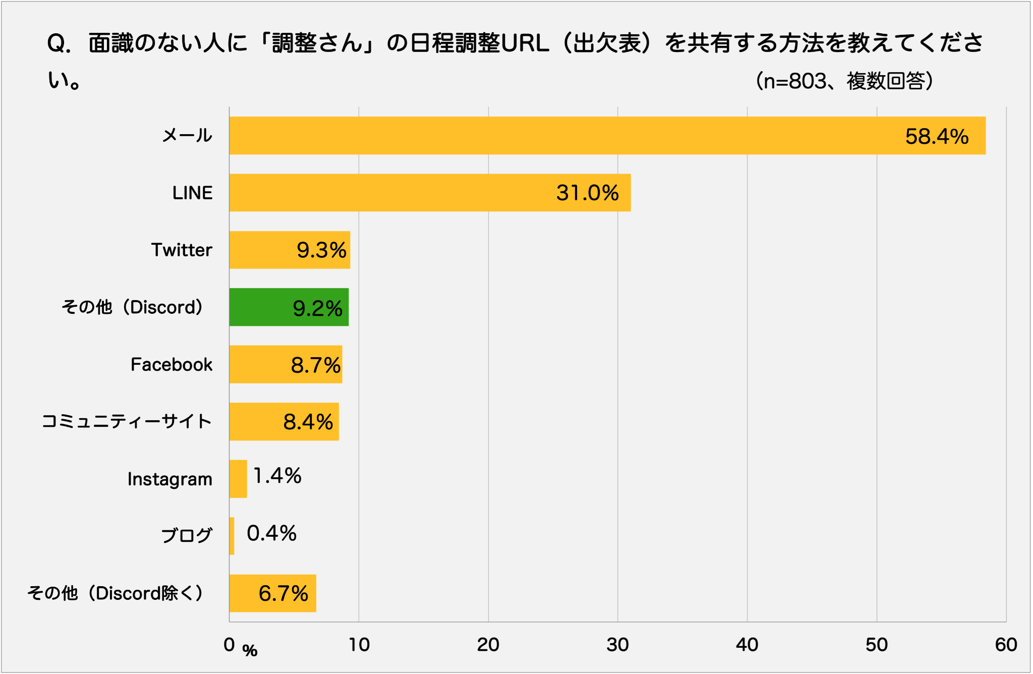 面識がない人との日程調整を「調整さん」でしたことが1度でもあると答えた人を対象に、「調整さん」のイベントURLの共有方法について、複数回答で聞きました。最も多かったのは、メールで58.4%、次にLINE(31.0%)が続きました。また、選択肢には設けていませんでしたが「その他」の自由回答で、Discord(ディスコード)と答える人が多く、集計の結果4番目の多さ(9.2%)となりました。
