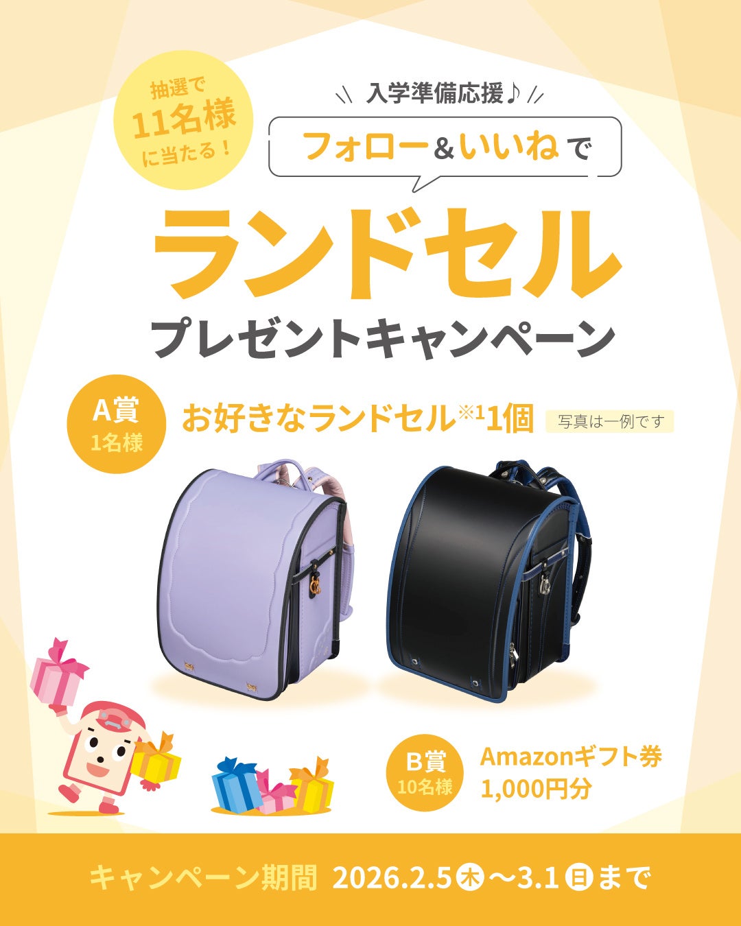 フィットちゃんでは、2027年度モデルの発売開始を記念して、『フォロー&いいねで!ランドセルプレゼントキャンペーン』を開催。募された方の中から抽選でお好きなランドセル1個やAmazonギフト券1,000円分をプレゼントするキャンペーンを開催。