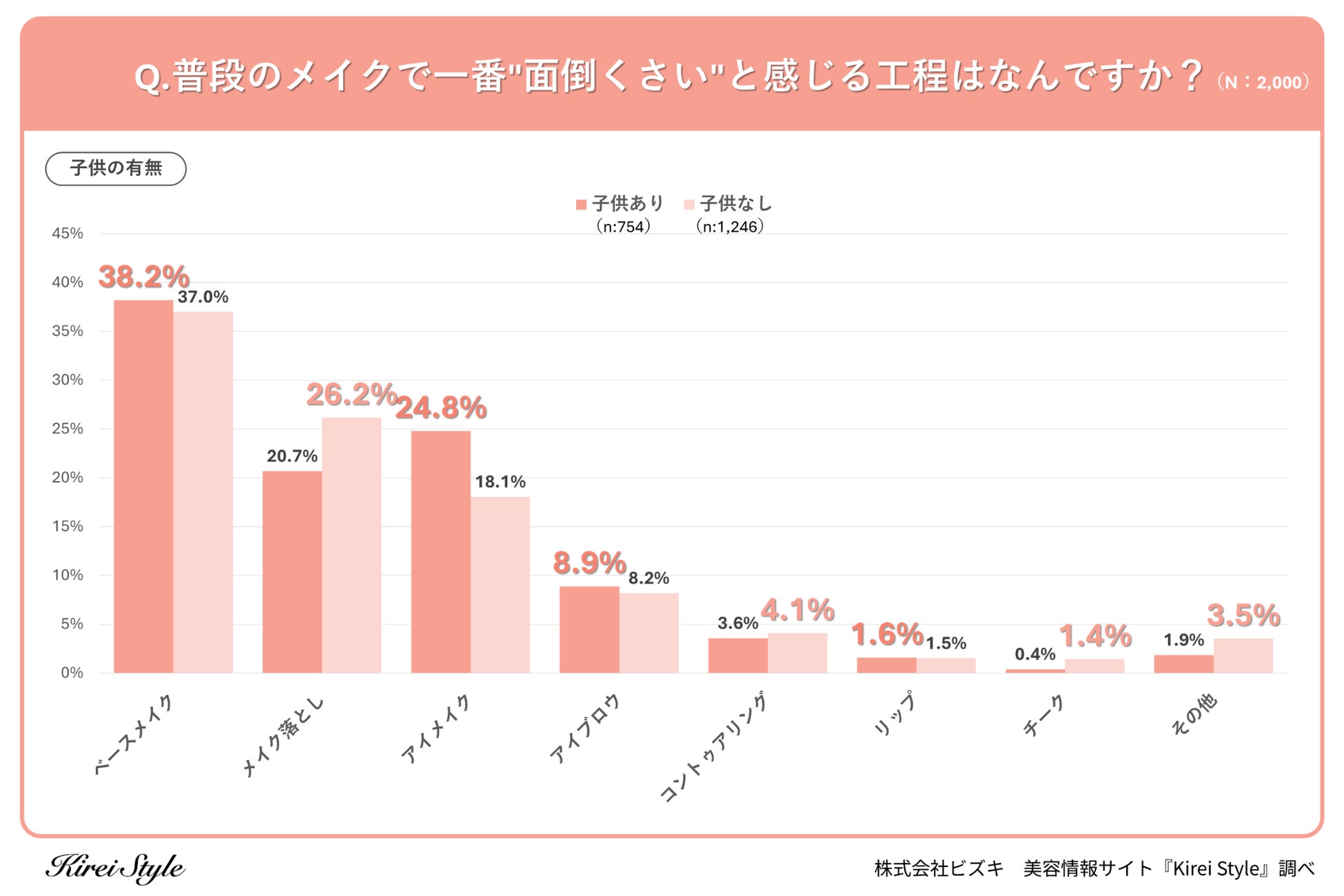 一方、「子供なし」では「メイク落とし」が上回る結果となりました。子供がいない方の場合、夜遅くまで仕事をしていたり友人や仕事仲間と食事に行ったりなど、遅い時間まで外にいることが比較的多い傾向があると言えます。疲れて帰宅した後にメイクを落とすことが、メイクをすることよりも面倒になっている方が多いことが推察されました。