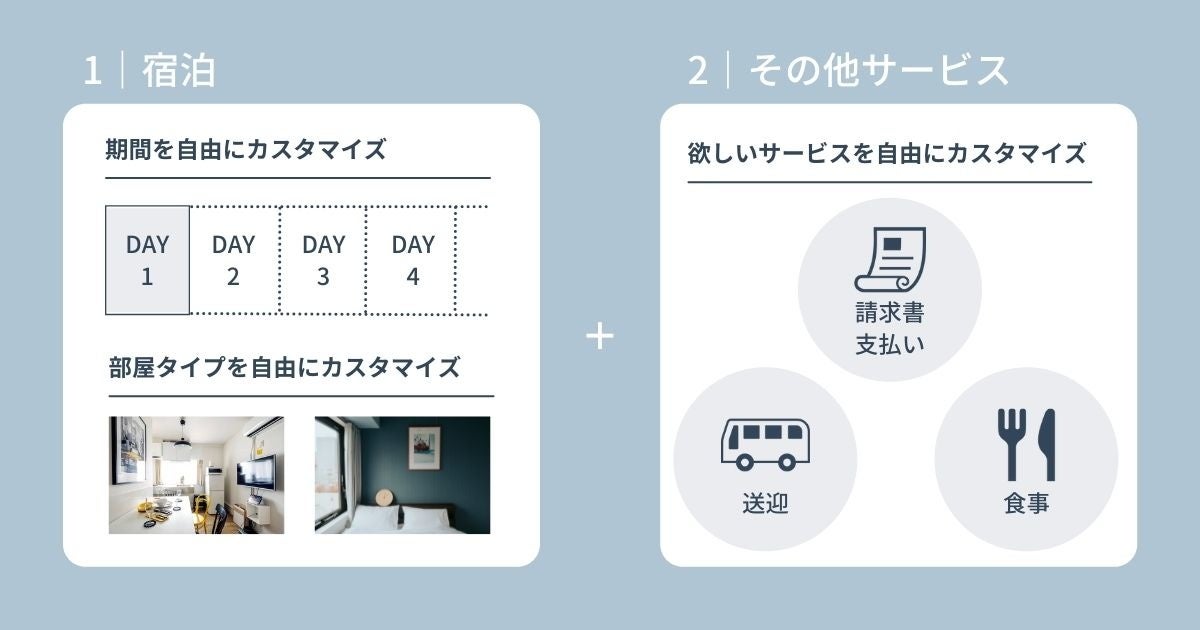 この度のアップデートでは、お客様のご要望に合わせてカスタマイズが可能になりました。ホテルの宿泊手配を基本とし、利用日数や食事手配および、送迎の有無などをお選びいただけるほか、お部屋についても、キッチン付きのアパートメントタイプのお部屋から、費用を抑えたホテルタイプのお部屋まで、幅広い選択肢からお選びいただけます。