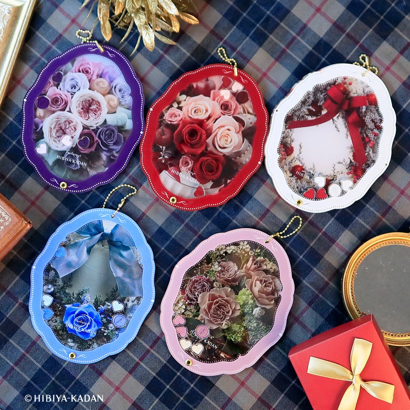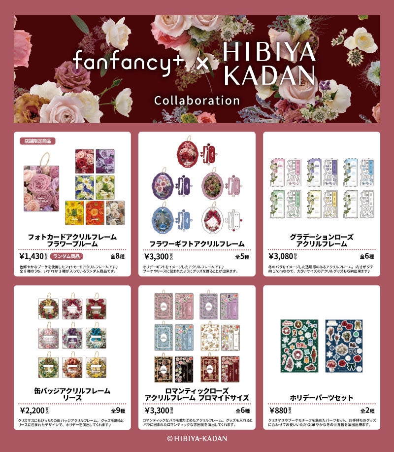 今回のコラボレーションでは、「ホリデー」をテーマに、日比谷花壇が手がけるフラワーアレンジメントや花柄を取り入れた、華やかなデザインのアイテムが登場します。定番のバラをはじめ、ホリデーシーズンにぴったりのリースなど、季節感あふれるモチーフを散りばめることで、推しのグッズをより美しく引き立てるラインナップとなりました。